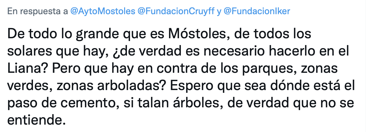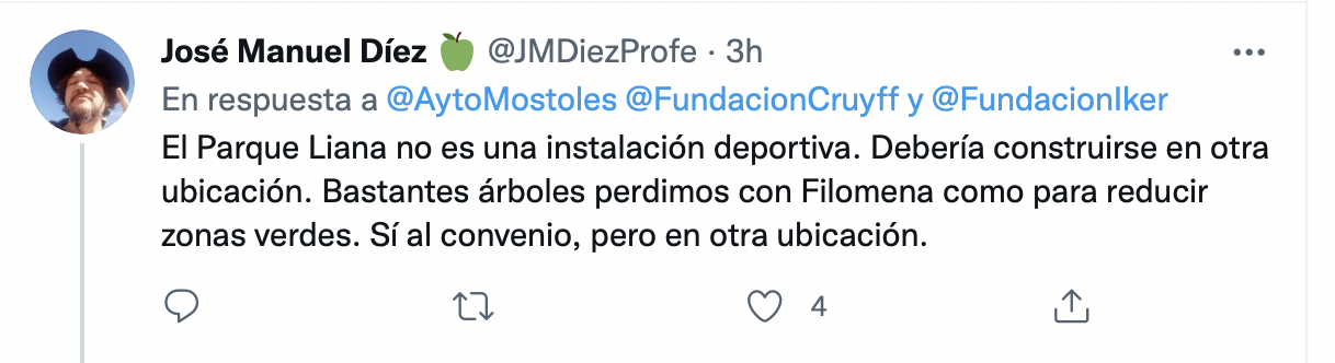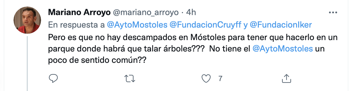 El Consistorio rápidamente ha explicado que “El proyecto se construirá en una pequeña zona de terrizo que está en desuso, colindante con el parque infantil del barco pirata, con lo que no afectará al arbolado ni modificará la estructura de los jardines ni los paseos. Será un pequeño espacio acondicionado para uso deportivo”. La portavoz de Podemos Móstoles, Monica Monterreal, en redes sociales también lo ha explicado